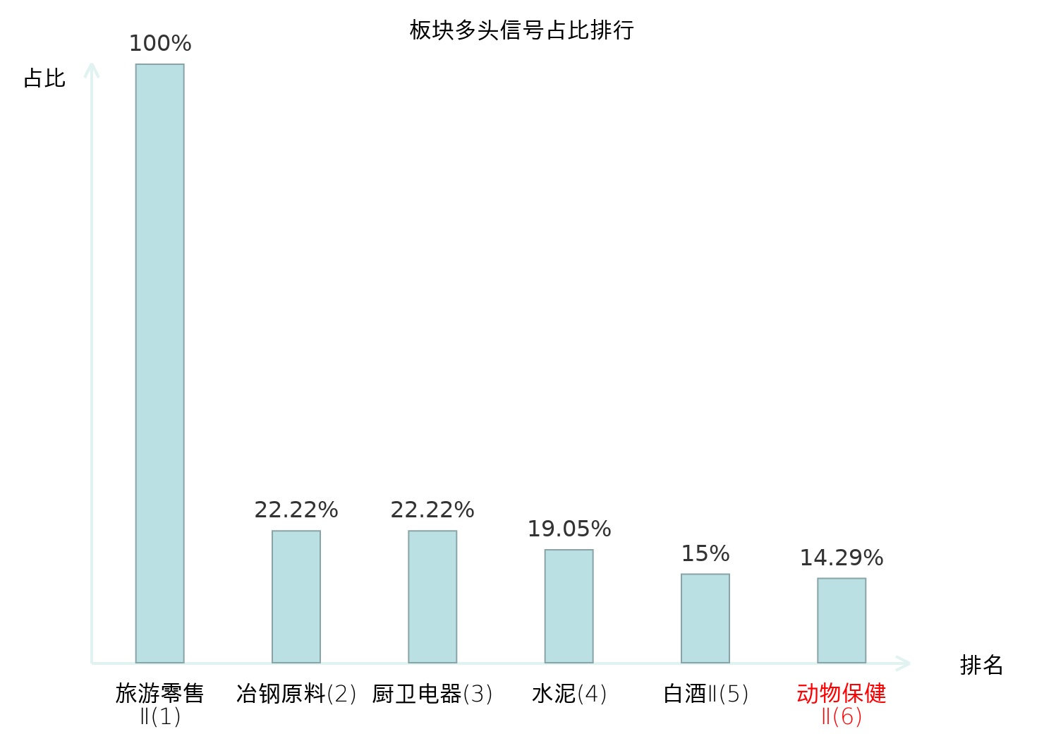 全市场所有行业板块中主力多头信号占比排名中,旅游零售Ⅱ板块位居第一。旅游零售Ⅱ板块名次提升最快,较昨日上升130位。