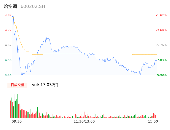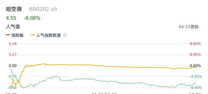 04月15日,哈空调收报4.55,股价涨幅-8.08%,成交金额7825.30万元,换手率4.44%。