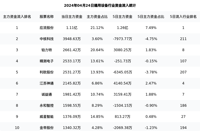 从主力资金流向来看,通用设备行业今日主力资金流入48.09亿元,在所有申万二级行业中排名:86/131。