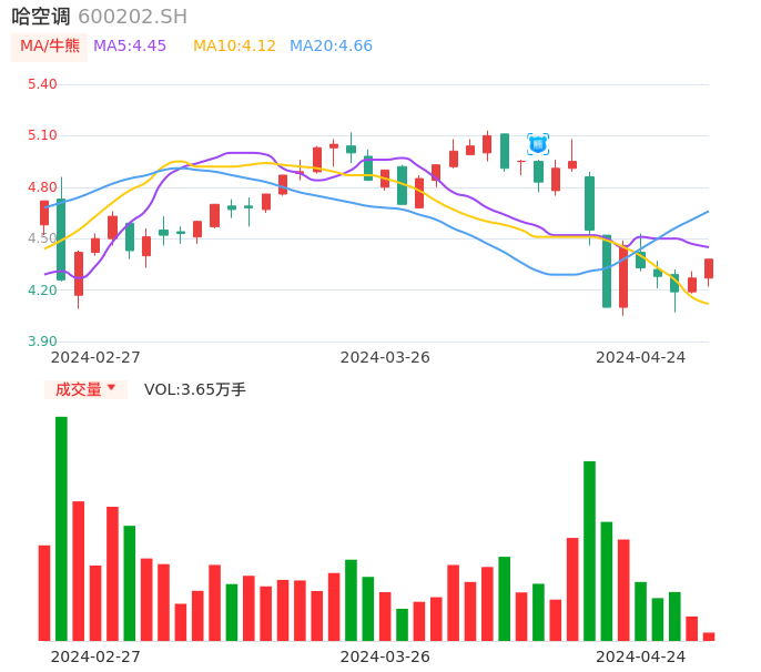 04月24日,哈空调收报4.38,股价涨幅2.58%,成交金额1583.44万元,换手率0.95%。