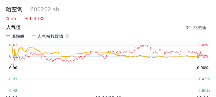 04月23日,哈空调收报4.27,股价涨幅1.91%,成交金额2094.09万元,换手率1.28%。