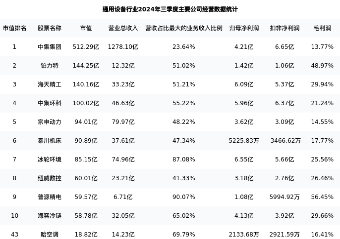 哈空调最新报告期数据为三季度,下表汇总了通用设备行业内市值靠前的公司三季度主要经营数据