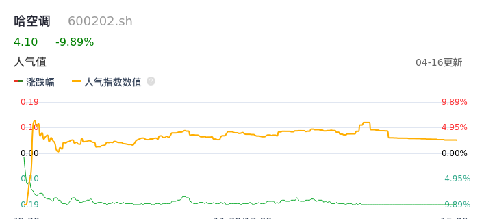04月16日,哈空调收报4.10,股价涨幅-9.89%,成交金额5107.04万元,换手率3.21%。