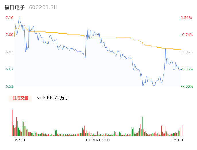 04月15日,福日电子收报6.67,股价涨幅-5.39%,成交金额4.57亿元,换手率11.25%。