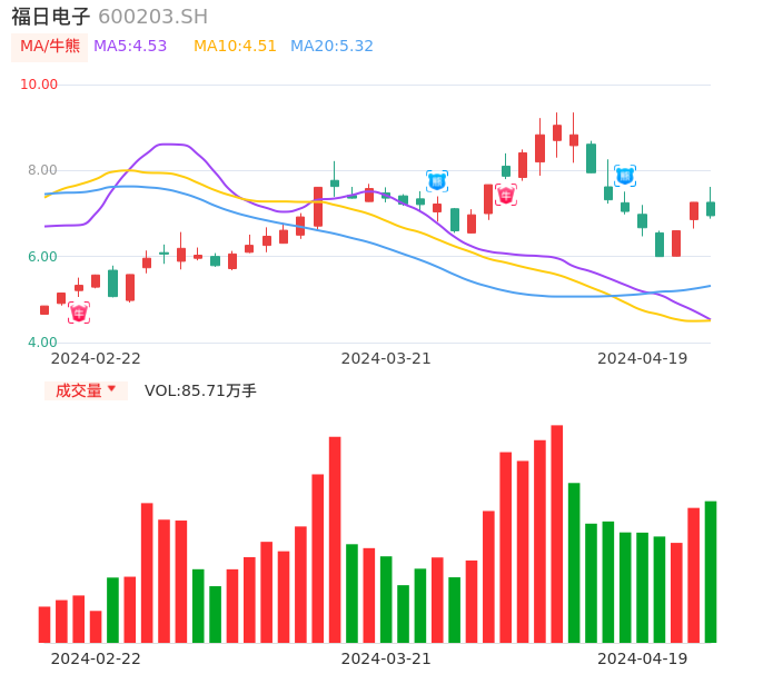 福日电子在4月12日出现日线级别熊点,虽然60分钟处于牛点区间,在未有效突破上方筹码压力位:7.38元前需要谨慎观望。