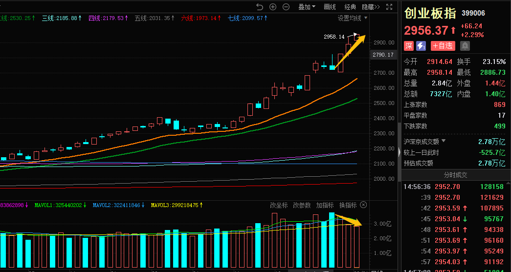创业板比较明显,连续缩量创新高,注意创业板的这种走势,典型的通过权重股对指数进行控盘,但是连续缩量难掩市场观望情绪,如继续缩量冲新高,则需谨慎这种量价背离可能带来的冲高回落风险。(毕竟今天盘中已经有几次小幅跳水,但都被权重成分股拉回来)。