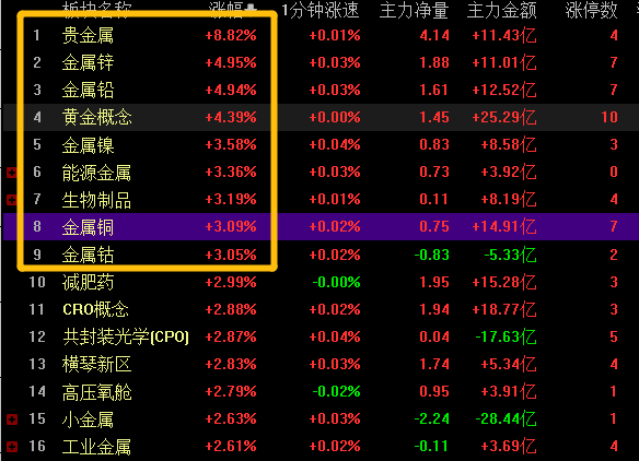 领涨的方向毫无疑问还是降息预期刺激+周末的统计局经济数据利好的贵金属方向。下午黄金概念好几个涨停板,日内也是有近10股涨停。绝大部分个股的位置都不低,因为之前涨价驱动走了一波,七月的时候就已经开始讲降息预期,今天很多个股算是加速了,唯一比较低位的就是中国黄金,刚刚突破年线(国资背景),但是这类股很难有超额的收益,需要时间和心态。