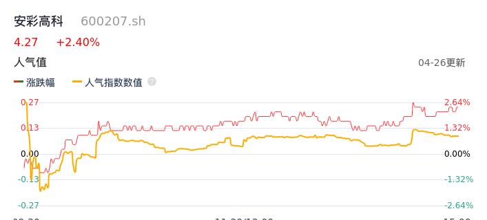 04月26日,安彩高科收报4.27,股价涨幅2.40%,成交金额6877.34万元,换手率1.55%。