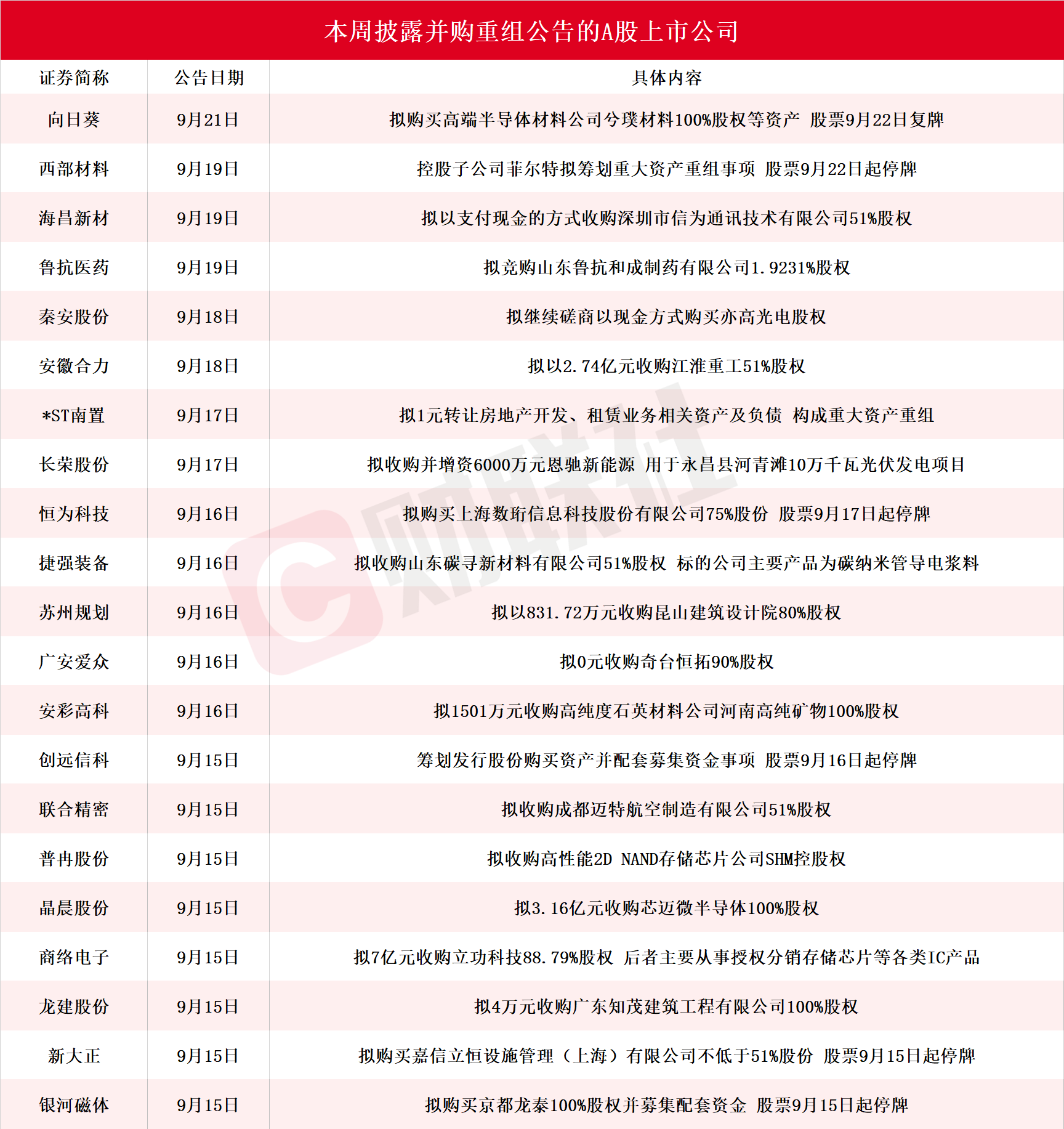 财联社9月21日讯(编辑 若宇)A股市场并购重组持续活跃。据财联社不完全统计,截至发稿,本周披露并购重组进展的A股上市公司共有21家,包括向日葵、西部材料、海昌新材、鲁抗医药、秦安股份、安徽合力、*ST南置、长荣股份、恒为科技、捷强装备、苏州规划、广安爱众、安彩高科、创远信科、联合精密、普冉股份、晶晨股份、商络电子、龙建股份、新大正、银河磁体,具体情况如下图: