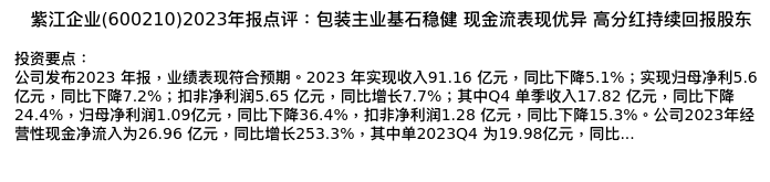 值得注意的是:2024年04月上海申银万国证券研究所的屠亦婷/张海涛分析师,首次发布关于紫江企业的研究报告,标题为:紫江企业(600210)2023年报点评:包装主业基石稳健 现金流表现优异 高分红持续回报股东。