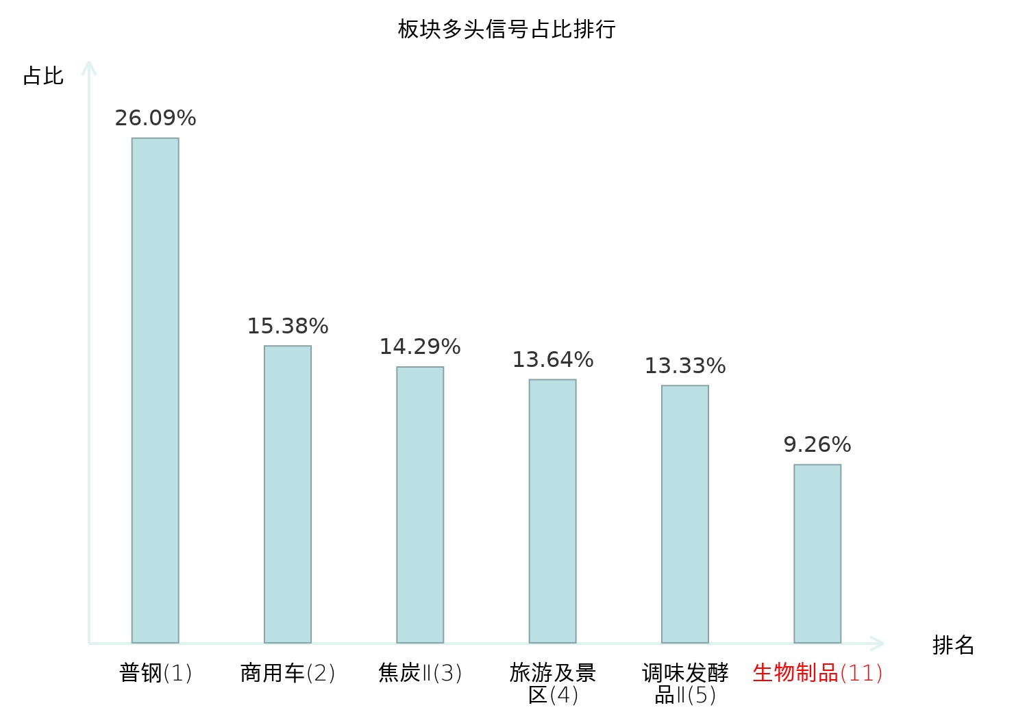 全市场所有行业板块中主力多头信号占比排名中,普钢板块位居第一。焦炭Ⅱ板块名次提升最快,较昨日上升119位。
