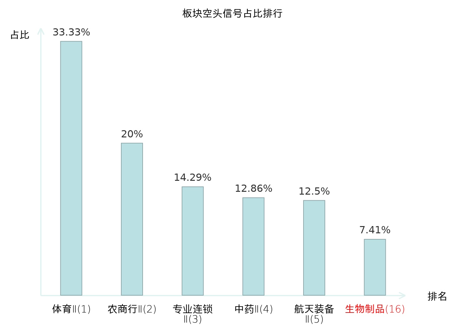 全市场所有行业板块中主力空头信号占比排名中,体育Ⅱ板块位居第一。医药商业板块名次提升最快,较昨日上升107位。