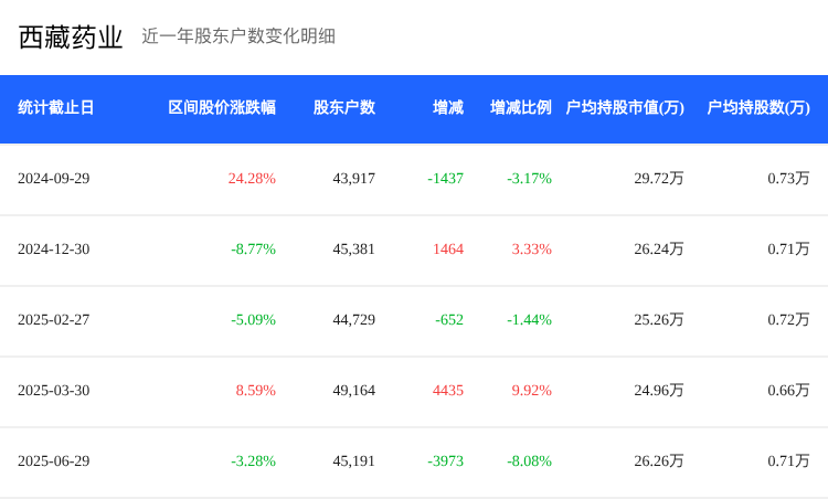 在2025年3月31日至2025年6月30日期间,西藏药业的股价表现不佳,出现了3.28%的跌幅。同时,市场的交易活跃度也有所下降,日均成交量减少了32.18%,日均换手率下降了32.12%。这可能与市场对西藏药业未来业绩的担忧有关,导致投资者信心减弱,愿意持有的股东数量减少。