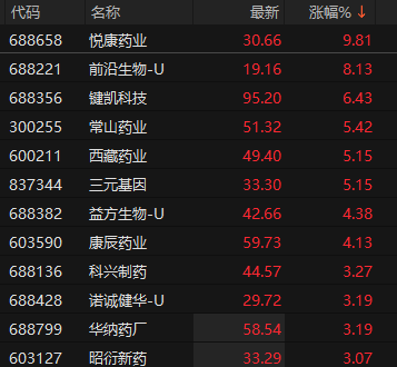 上证报中国证券网讯 9月3日早盘,创新药概念股拉升,截至9时47分,悦康药业涨超9%,前沿生物涨超8%,常山药业、西藏药业涨逾5%,科兴制药等纷纷走高。