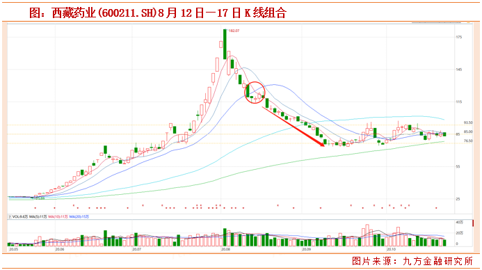 上述第一条“如果在下跌趋势中途出现下跌三颗星组合,应当做好减仓离场的准备”适用于前期涨幅较大的强势股回调趋势中。典型案例股如西藏药业(600211.SH)8月12日—17日K线组合。