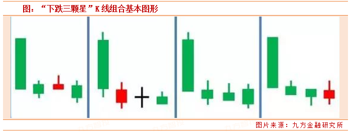 下跌三颗星,由四根K线组合而成,首先收一根弱势下跌的大阴线或中阴线,随后在大阴线的右下方出现三根并排的实体小K线,阴线、阳线、十字星均可。