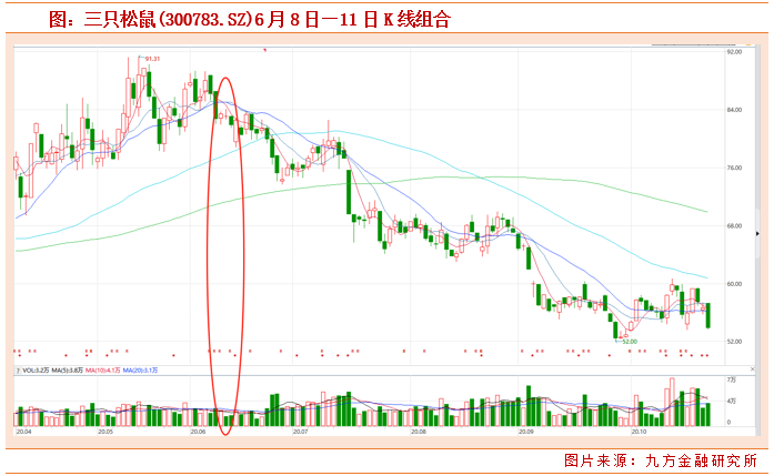 第二条是威力也比较大的一种类型,是趋势反转的起点。例如典型案例股如三只松鼠(300783.SZ)6月8日—11日K线组合。