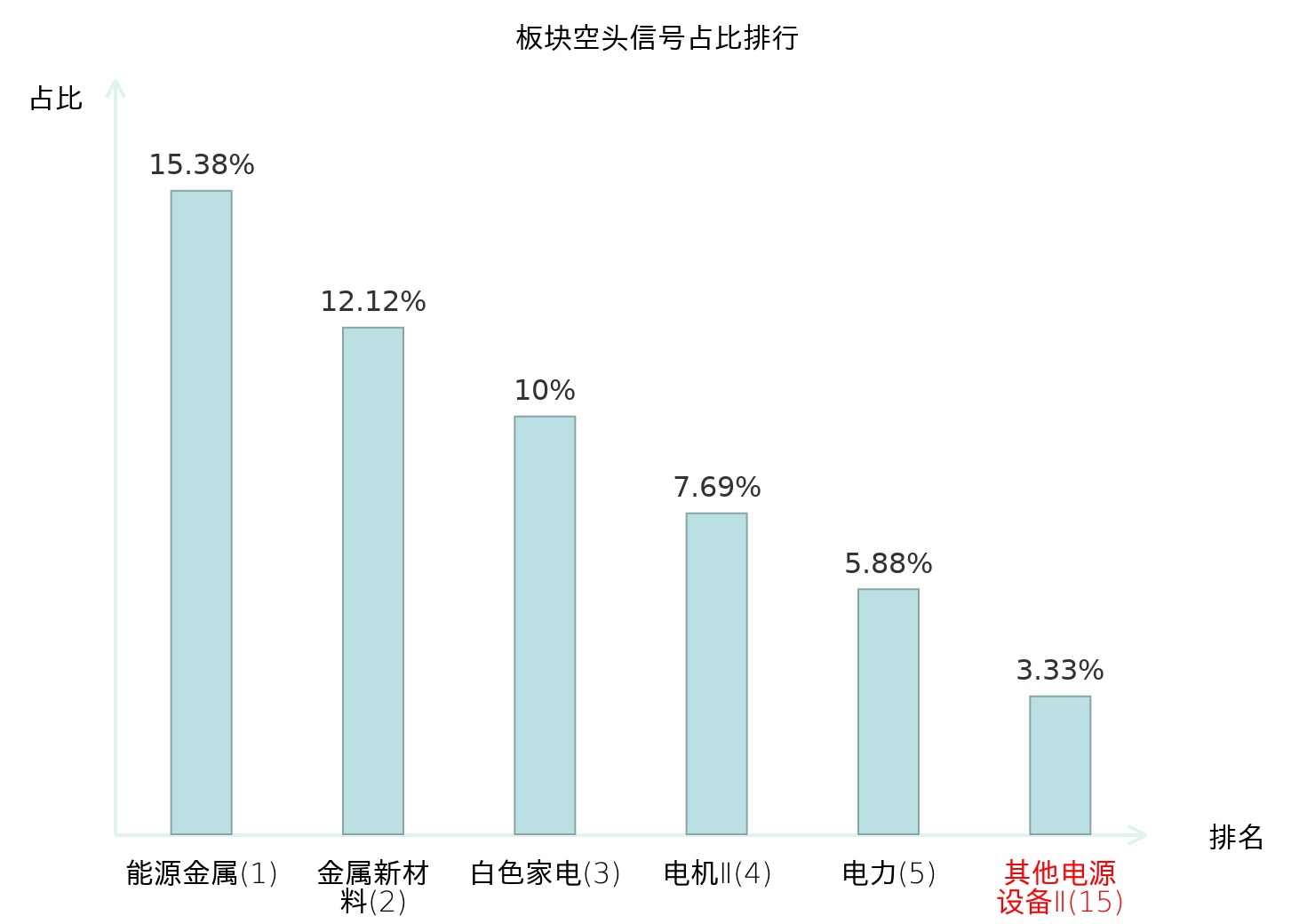 全市场所有行业板块中主力空头信号占比排名中,能源金属板块位居第一。医疗服务板块名次提升最快,较昨日上升106位。