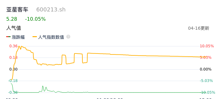 04月16日,亚星客车收报5.28,股价涨幅-10.05%,成交金额5344.48万元,换手率3.51%。