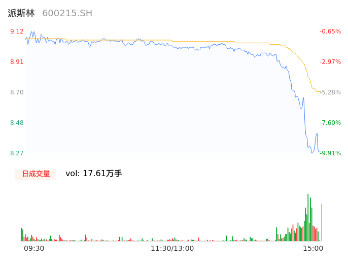 04月25日,派斯林收报8.30,股价涨幅-9.59%,成交金额1.53亿元,换手率3.86%。