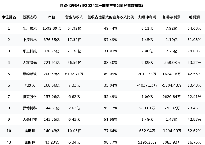 派斯林最新报告期数据为一季度,下表汇总了自动化设备行业内市值靠前的公司一季度主要经营数据