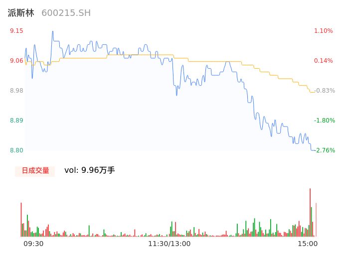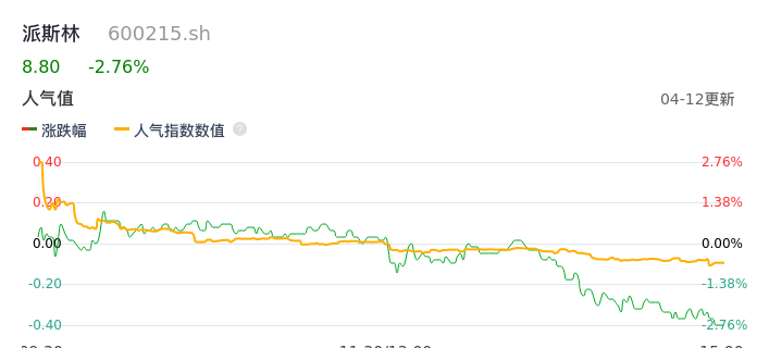 04月12日,派斯林收报8.80,股价涨幅-2.76%,成交金额8925.79万元,换手率2.18%。
