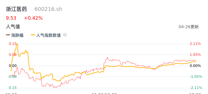 04月26日,浙江医药收报9.53,股价涨幅0.42%,成交金额1.65亿元,换手率1.82%。
