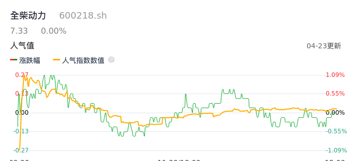 04月23日,全柴动力收报7.33,股价涨幅0.00%,成交金额2850.57万元,换手率0.94%。