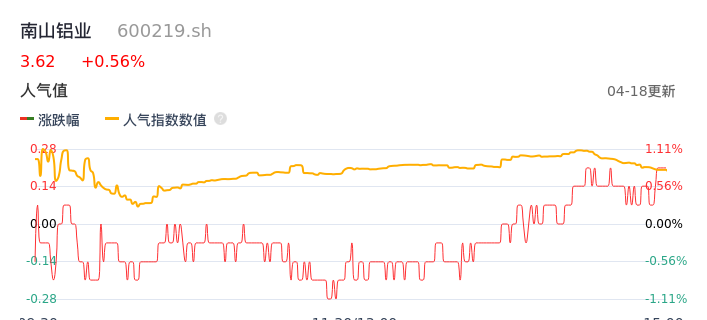 04月18日,南山铝业收报3.62,股价涨幅0.56%,成交金额4.27亿元,换手率1.02%。