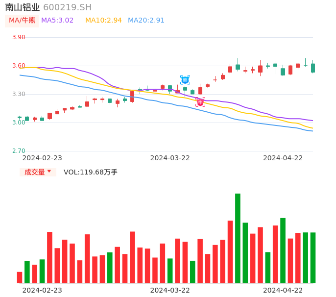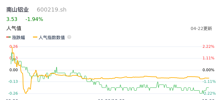 04月22日,南山铝业收报3.53,股价涨幅-1.94%,成交金额4.28亿元,换手率1.02%。