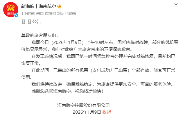 上证报中国证券网讯 1月9日,海南航空在微博上回应部分航线机票价格显示异常。1月9日上午10时左右,海南航空因系统临时故障,部分航线机票价格显示异常。海南航空表示,对于给广大旅客带来不便深表歉意。在发现该情况后,公司已第一时间紧急排查处理并完成系统修复,目前均已恢复正常。在此期间,已售出的所有机票(支付成功并已出票)全部有效,旅客可正常使用。公司将持续改进,确保系统稳定,为旅客提供更加安全、可靠的服务体验。