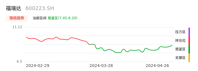 我们来看一下该股的九方特色指标强弱趋势的情况:福瑞达自03月27日从持仓区下穿到观望区。股价近期持续下跌后,短期出现止跌迹象。后续重点关注能否再次站上多空分界点:8.20元。如未能有效突破则可能进入新一轮空头行情。