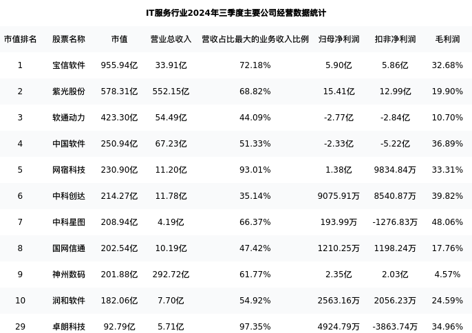 卓朗科技最新报告期数据为三季度,下表汇总了IT服务行业内市值靠前的公司三季度主要经营数据