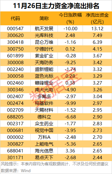 今日31股主力资金净流出均超2亿元,其中,航天发展、光库科技、昆仑万维、宁德时代、紫金矿业、天海防务、盛新锂能等热门股净流出金额均超3亿元。