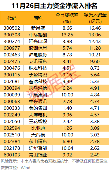 CPO概念今日持续走强,新易盛、中际旭创主力资金分别净流入16.46亿元、13.06亿元,居前。