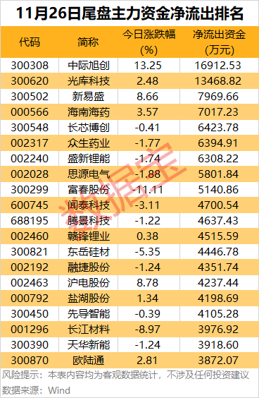 尾盘主力资金净流出方面,中际旭创、光库科技尾盘主力资金净流出均超1亿元;新易盛、海南海药、长芯博创、众生药业、盛新锂能尾盘主力资金净流出均超6000万元。