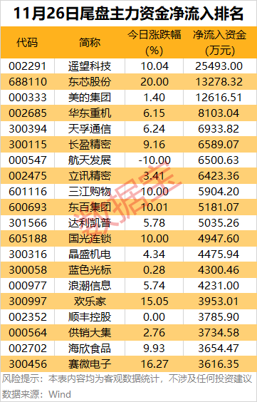 个股方面,遥望科技、东芯股份、美的集团3股尾盘主力资金净流入超1亿元。