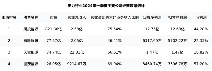 瀚叶股份最新报告期数据为一季度,下表汇总了电力行业内市值靠前的公司一季度主要经营数据