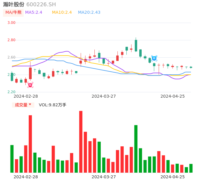 04月25日,瀚叶股份收报2.48,股价涨幅-0.40%,成交金额2439.66万元,换手率0.32%。
