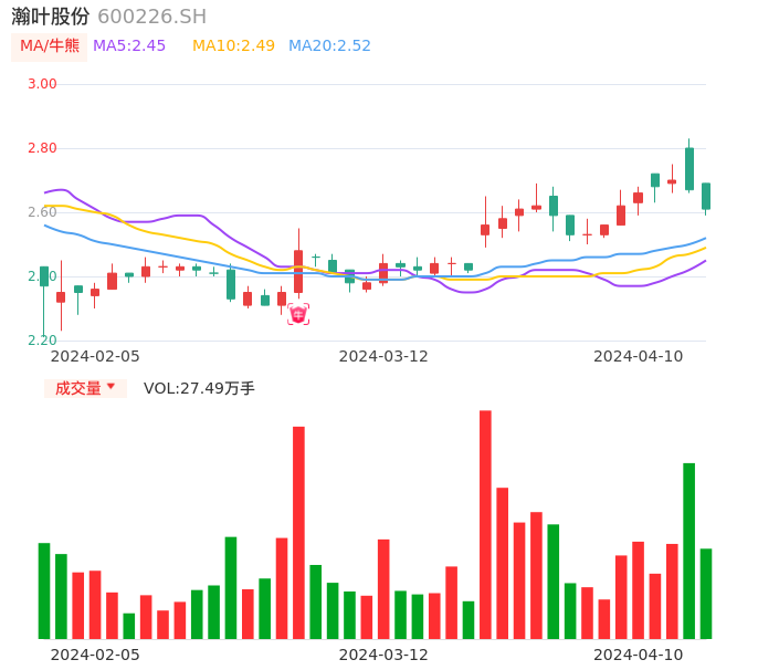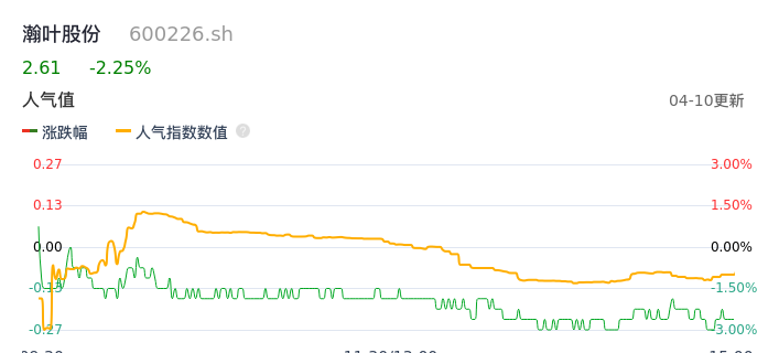 04月10日,瀚叶股份收报2.61,股价涨幅-2.25%,成交金额7220.25万元,换手率0.88%。