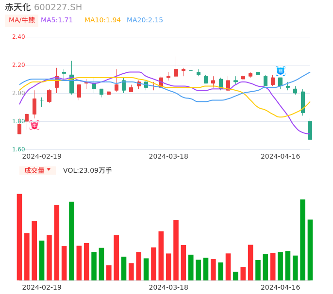 04月16日,赤天化收报1.67,股价涨幅-10.22%,成交金额3922.84万元,换手率1.81%。