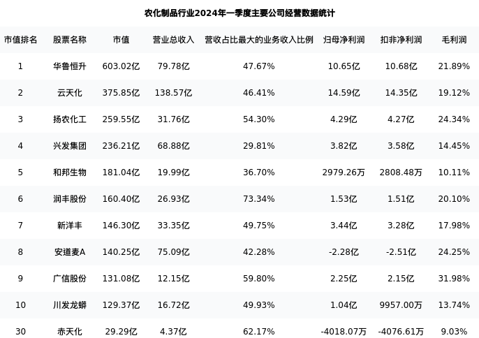赤天化最新报告期数据为一季度,下表汇总了农化制品行业内市值靠前的公司一季度主要经营数据