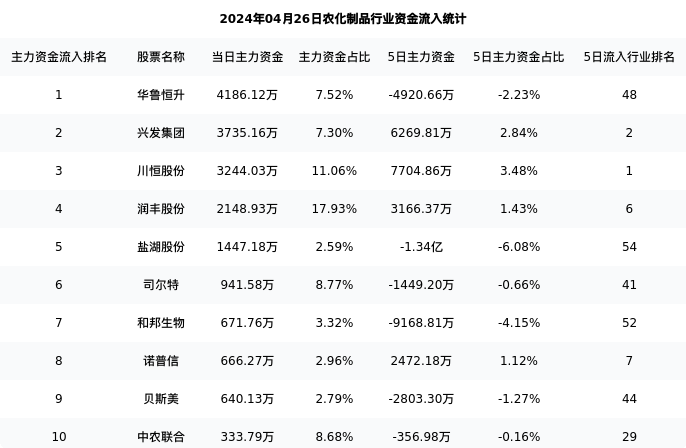 从主力资金流向来看,农化制品行业今日主力资金流入26.04亿元,在所有申万二级行业中排名:116/131。