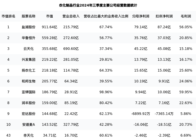 赤天化最新报告期数据为三季度,下表汇总了农化制品行业内市值靠前的公司三季度主要经营数据