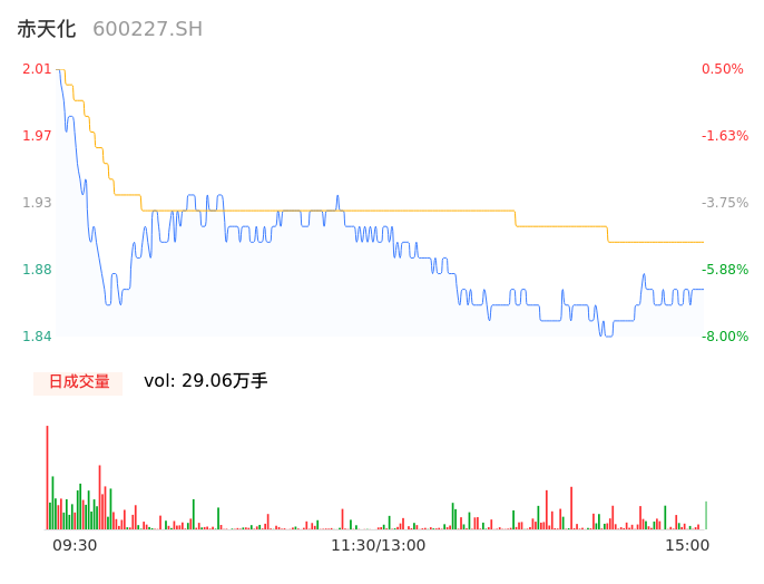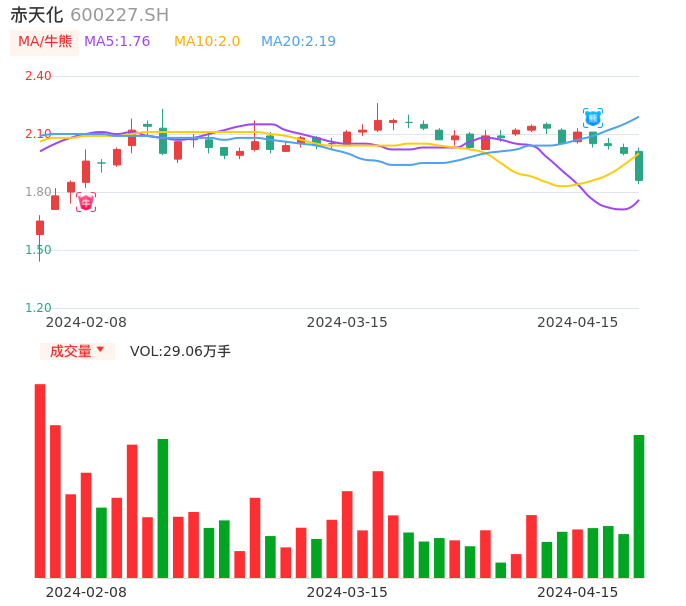 04月15日,赤天化收报1.86,股价涨幅-7.00%,成交金额5519.40万元,换手率2.27%。