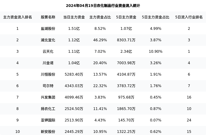 从主力资金流向来看,农化制品行业今日主力资金流入45.08亿元,在所有申万二级行业中排名:14/131。