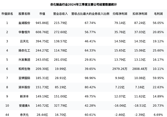 赤天化最新报告期数据为三季度,下表汇总了农化制品行业内市值靠前的公司三季度主要经营数据