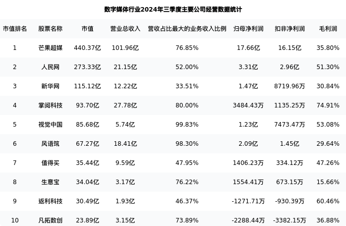 返利科技最新报告期数据为三季度,下表汇总了数字媒体行业内市值靠前的公司三季度主要经营数据