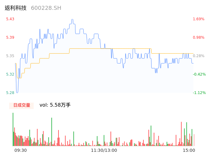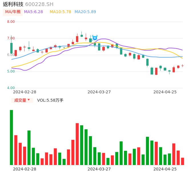 04月25日,返利科技收报5.34,股价涨幅0.00%,成交金额2988.08万元,换手率1.86%。