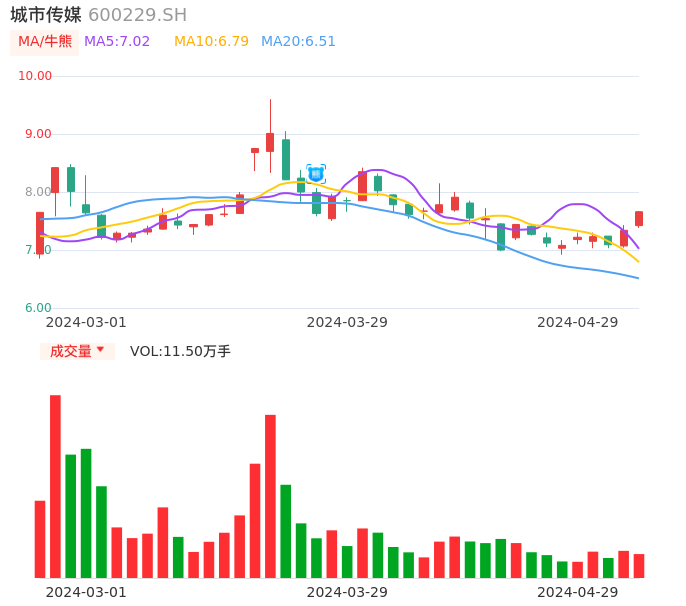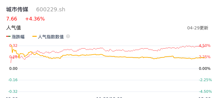04月29日,城市传媒收报7.66,股价涨幅4.36%,成交金额8713.58万元,换手率1.71%。